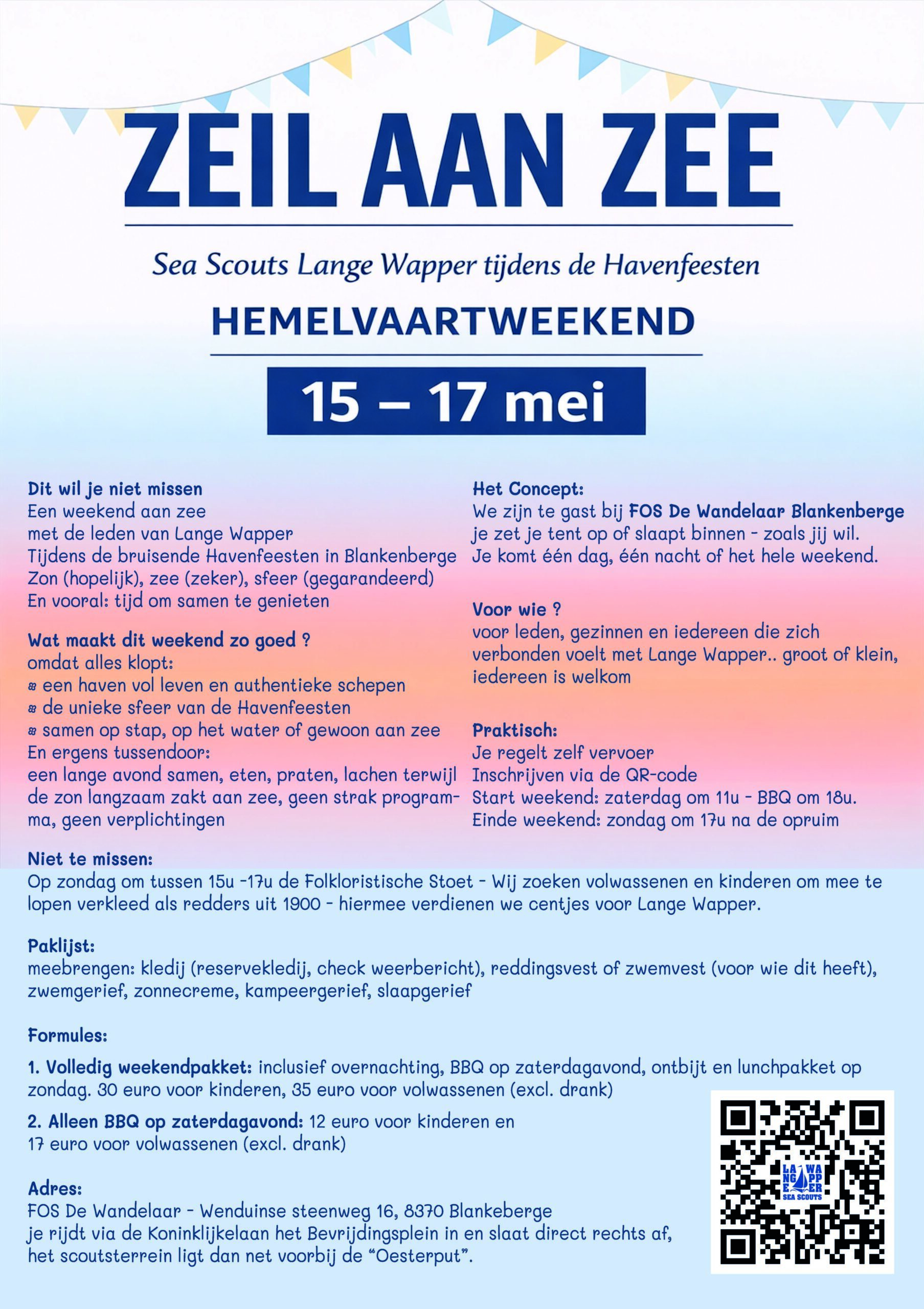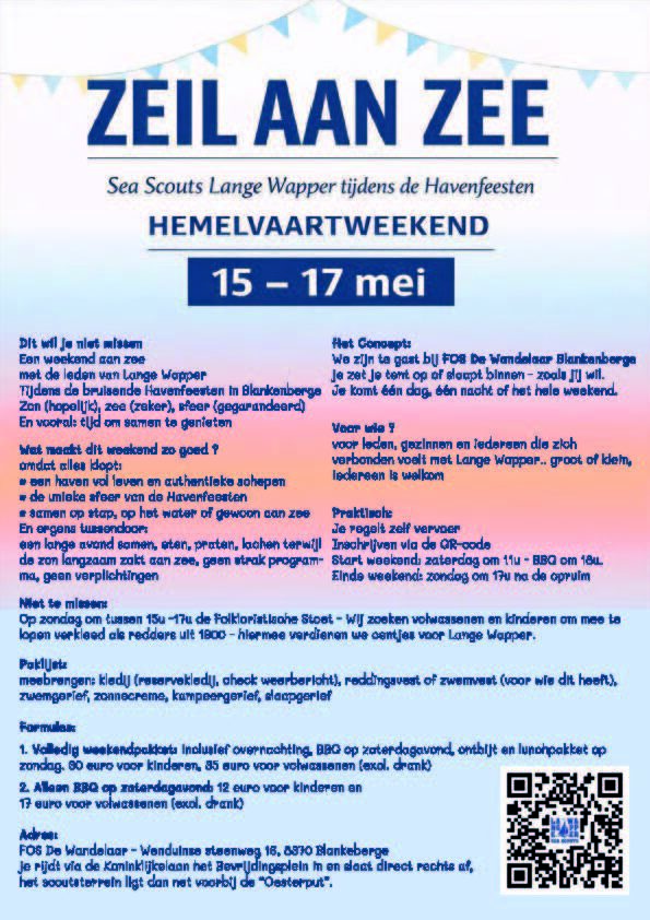 De scouts en gidsen van de 1ste FOS Lange Wapper nodigen u, op zondag 3 mei 2026, uit op hun opening vaarseizoen, aansluitend is er het Kippenfestijn. Klik hier voor meer info.
